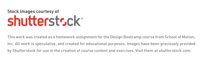 This work was created as a homework assignment for the Design Bootcamp course from School of Motion, Inc. All work is speculative, and created for educational purposes. Images have been graciously provided by Shutterstock for use in the creation of course content and exercises. Visit them at shutterstock.com.